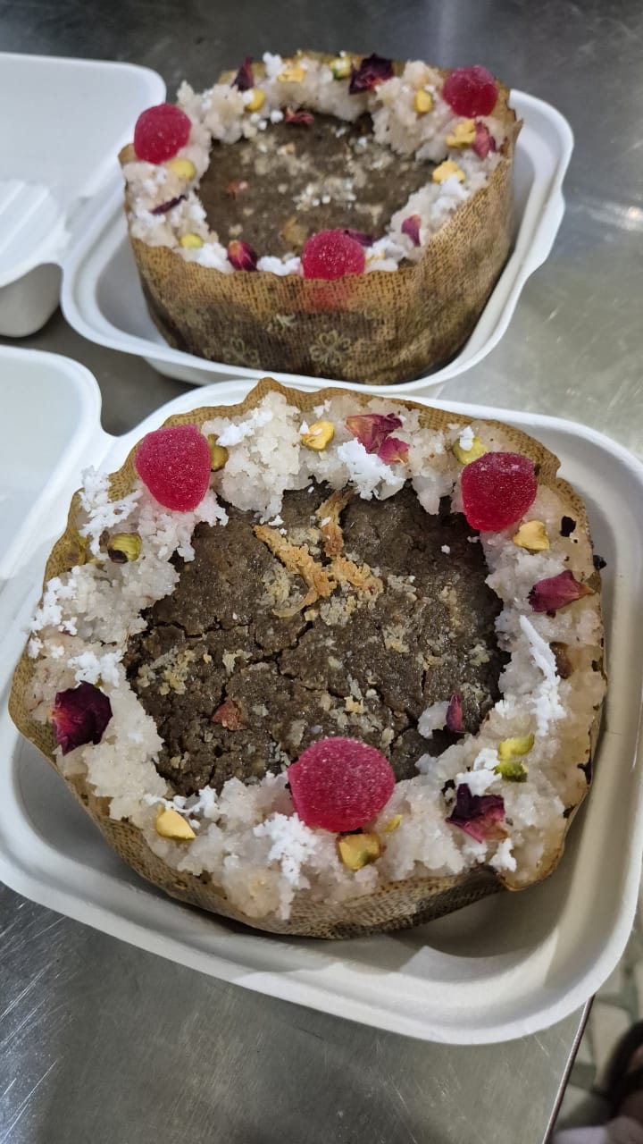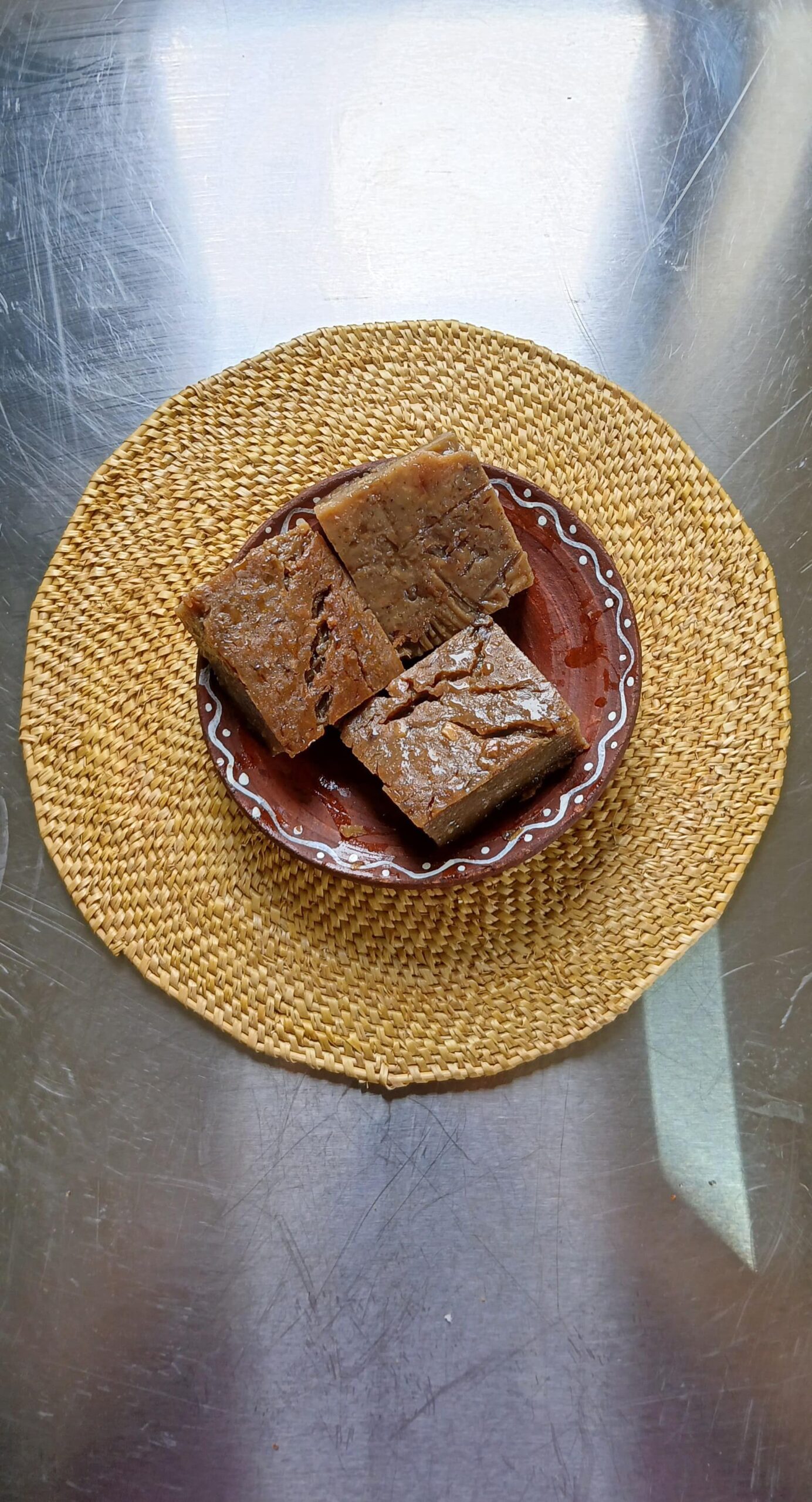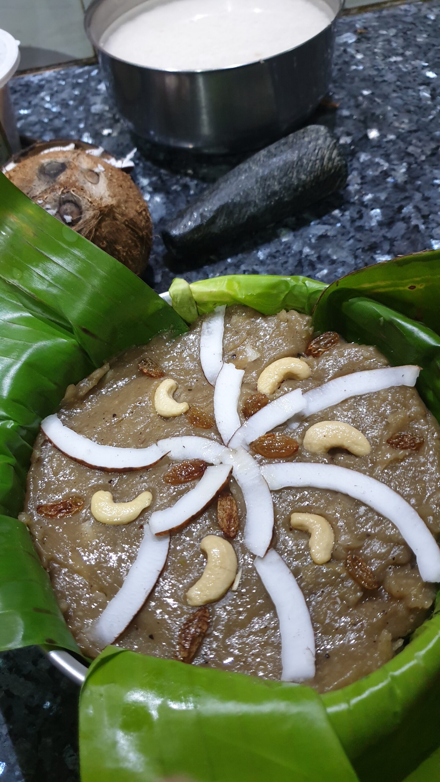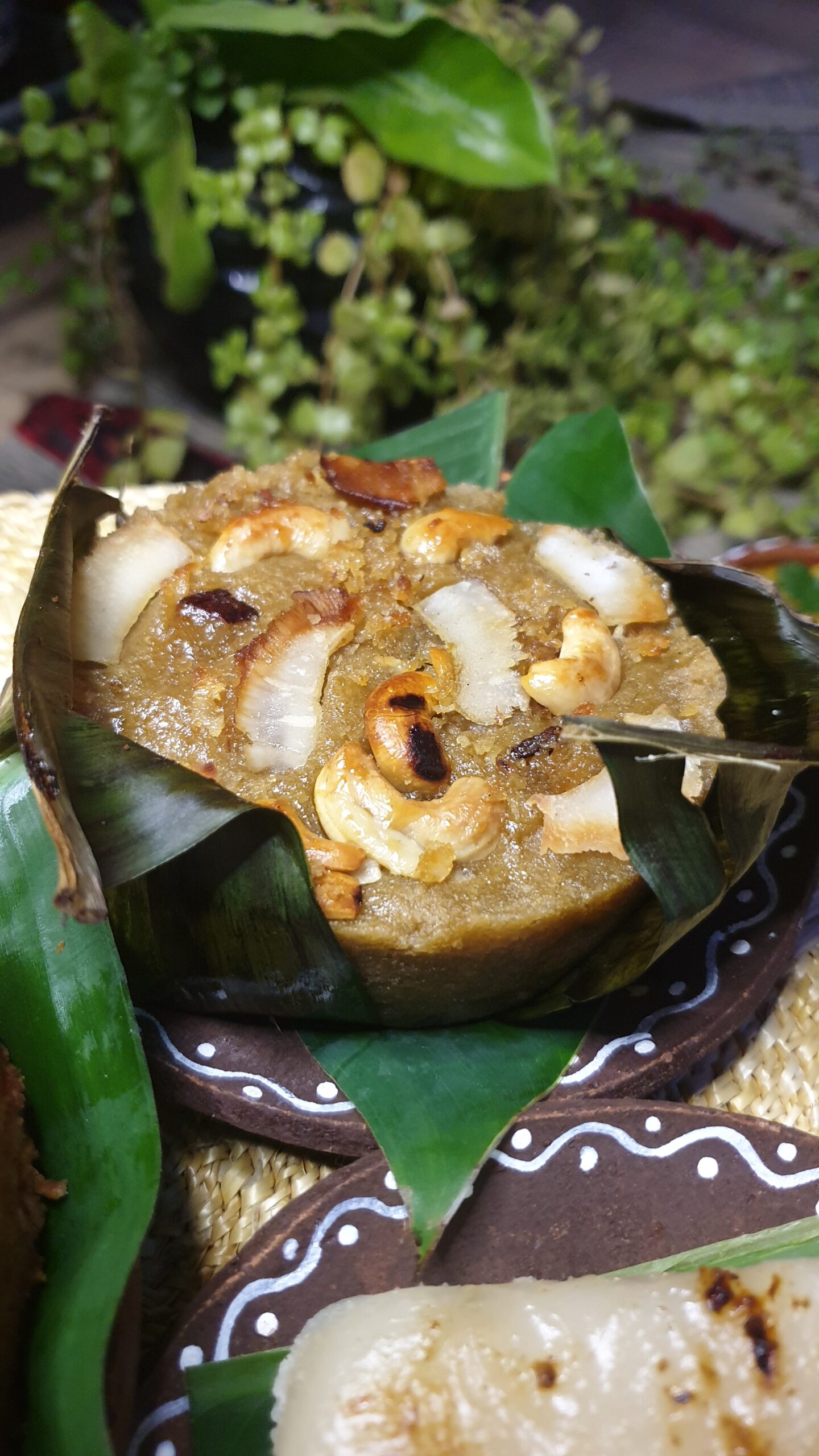 Slow cooked rice cake made with jaggery, coconut, ginger and cardamom, offering a rich and caramelized flavour in every bite.