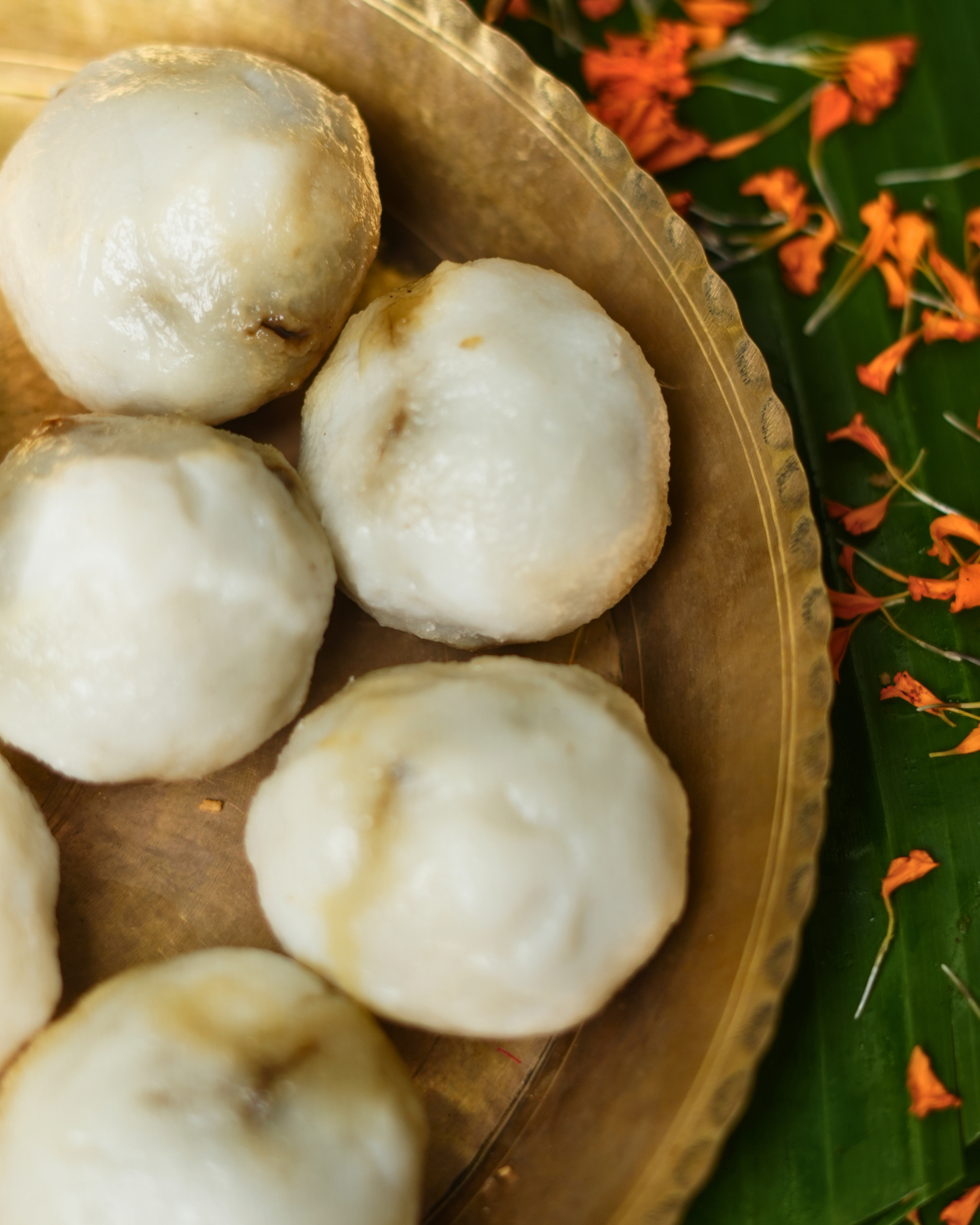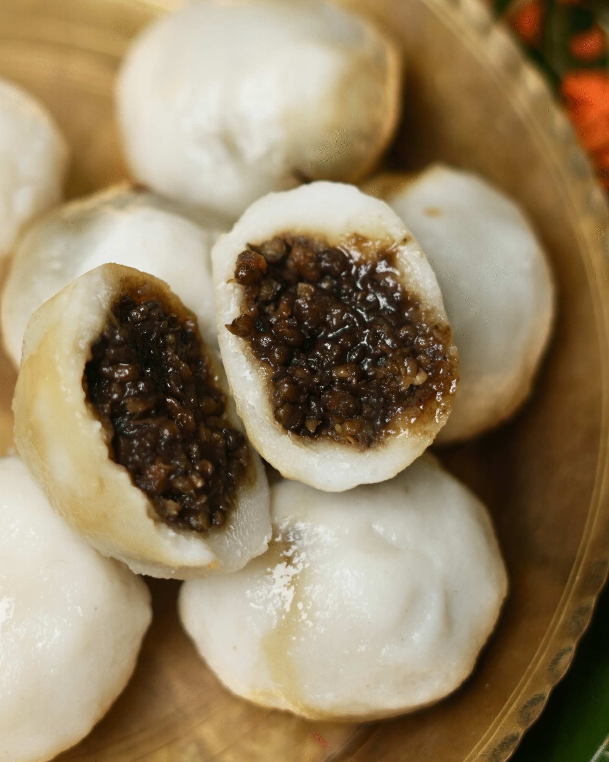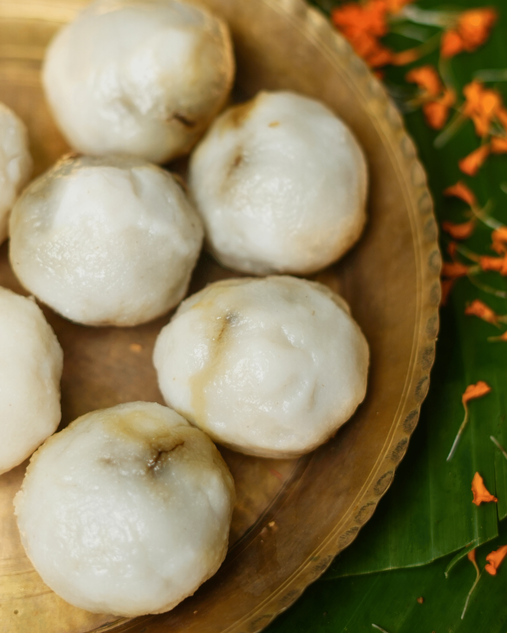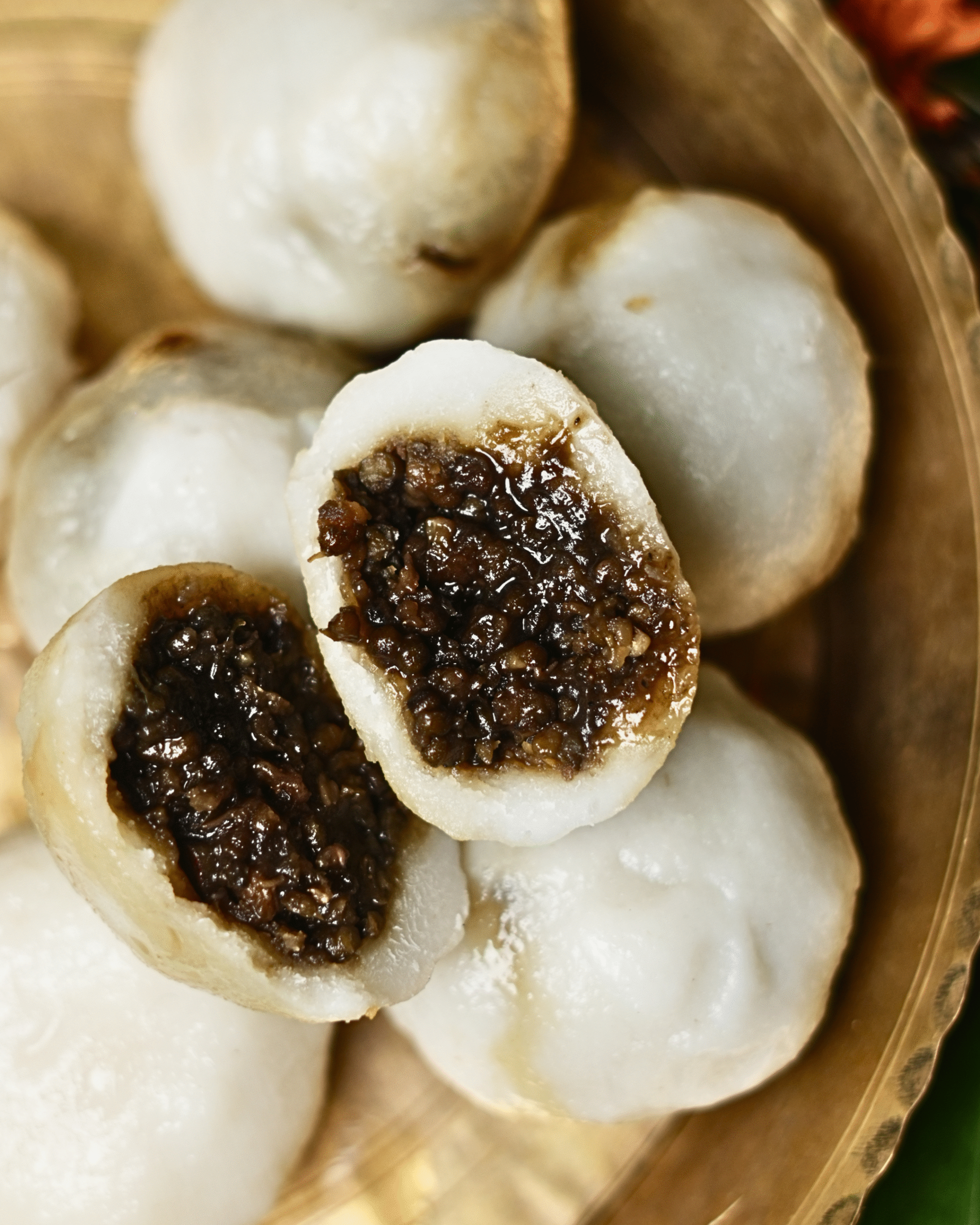 Steamed rice dumplings filled with mongdalncaramelized with jaggery, coconut and a hint of ginger and cinnamon for a sweet, spiced indulgence.